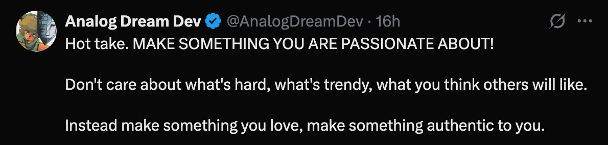Crazy stuff if you ask me. Why do so many indie developers think this way? It’s not like players are dying to bear witness to [insert random developer]’s authentic self. Trends are trends because people like them. Players are pleased, even thrilled, to get more games in genres they love. Sales figures and reviews for recent hit games in trendy genres like RV There Yet (est. $20.6M gross) and CloverPit (est. $10M gross) prove this. While the thread from Gorka Games is a little clunky, it echoes perspectives shared by prominent games market analysts Chris Zukowski and Simon Carless. Simply put: make a great game in a proven genre that players love and you’re more likely to find commercial success. Seems pretty uncontroversial.