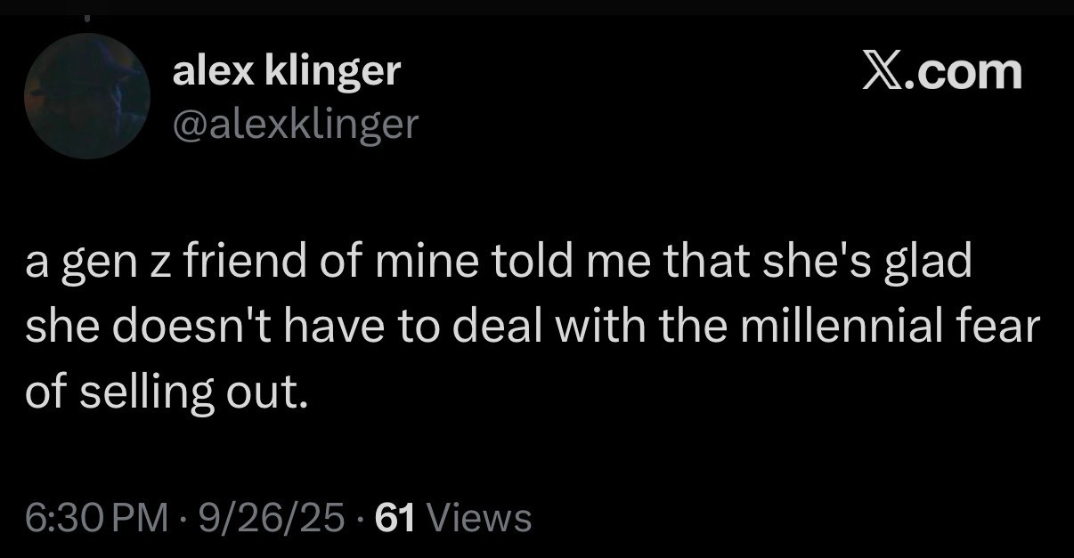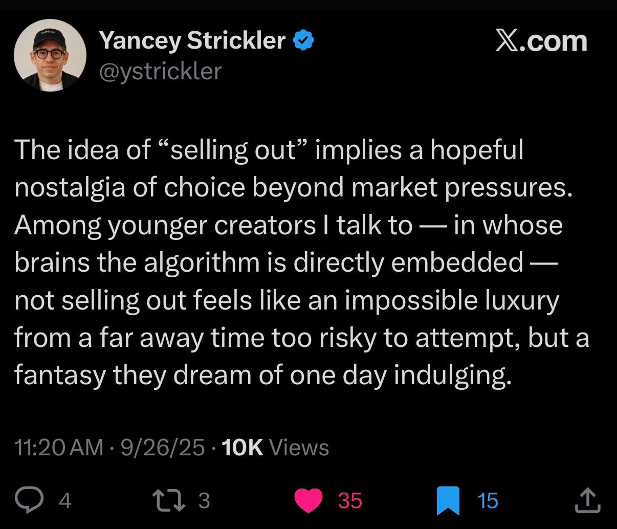 Please be clear: We are rightly regarded as the Most Unsanctimonious sletter out. But we think the anti-sellout ethos is tight, and worth talking about, especially here in 2025, long past the concept’s supposed expiration date — not least because it can help make all of us feel less cynical, defeated, lonely and insane.
