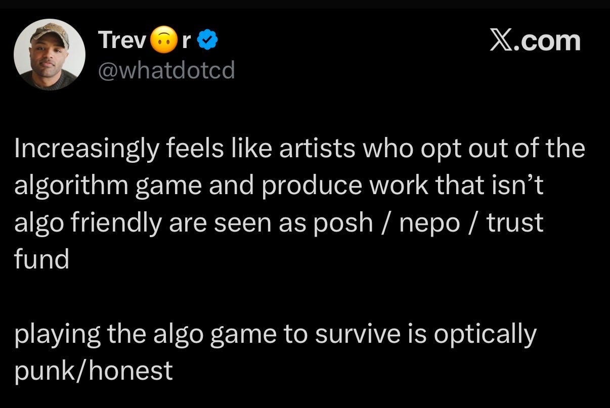 A couple more examples: cofounder of Kickstarter Yancey Strikler and founder of Brud Trevor McFedries (he and his team created the fictional influencer Lil Miquela) see the anti-sellout discourse as outdated, while producing work for the algorithm and making some money in the process is punk.